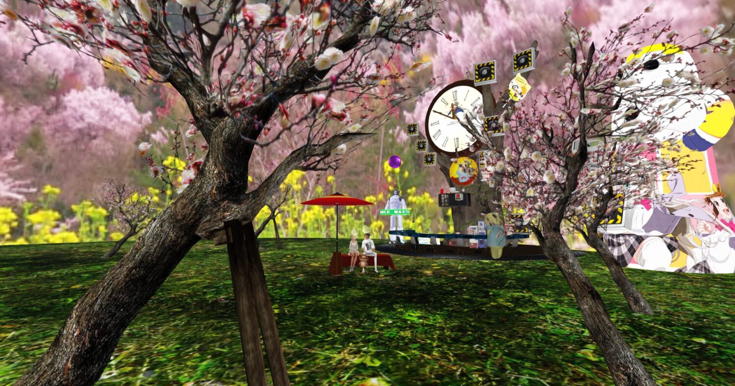 店内は春の雰囲気?プラス梅の木を植えたりしています。まったりお茶してもOK、音楽に合わせて踊ってもOK!花のパーティクルをまきまくってもOK 存分にこの空間をお楽しみ下さい。